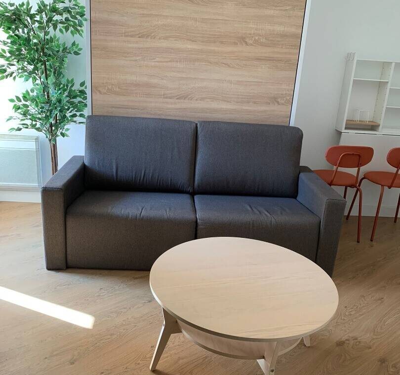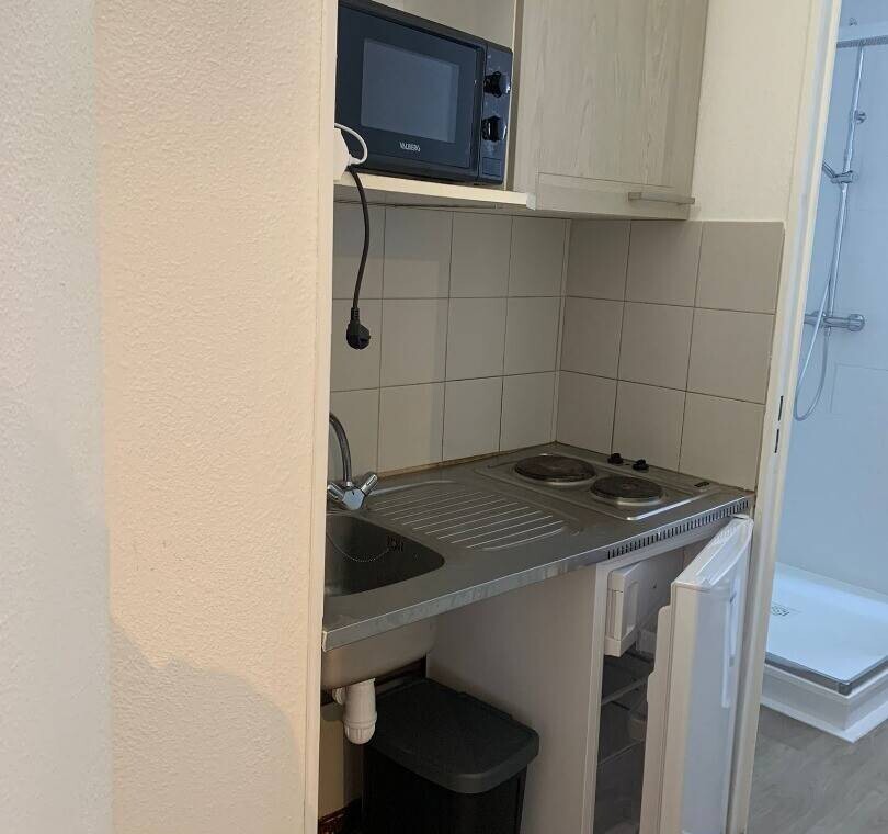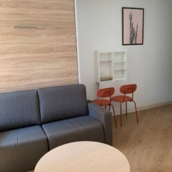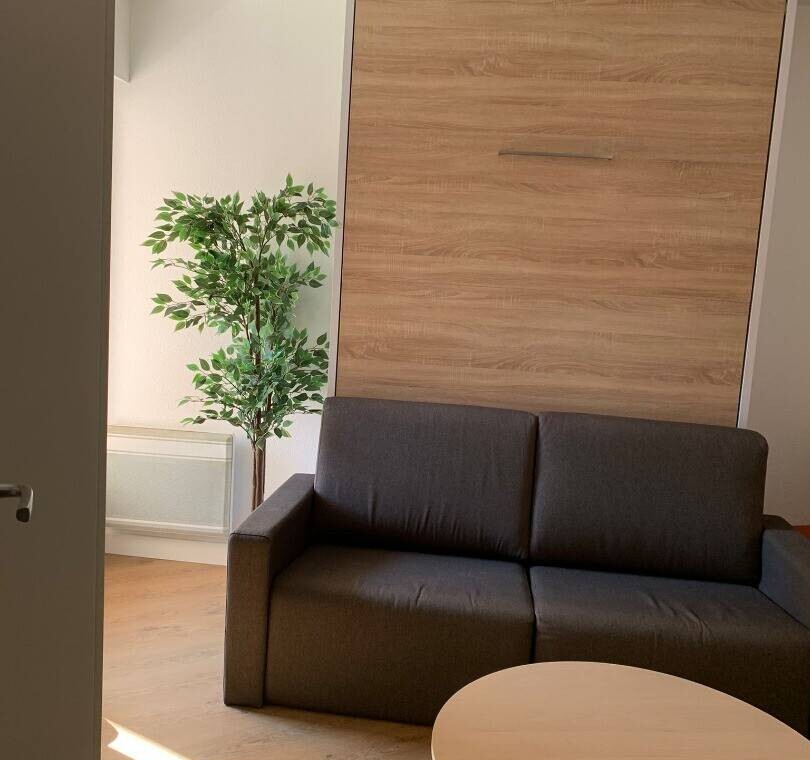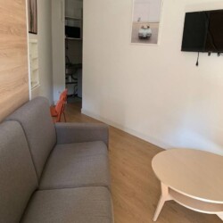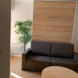 Ce superbe appartement studio, entièrement meublé, dispose d’une salle de bain avec douche et WC, d’un coin salon/chambre avec un lit escamotable 2 places, un canapé et d’une cuisine équipée de plaques de cuisson, d’un réfrigérateur et d’un four à micro-ondes.